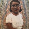 This is an icon showing a young girl learning the English words such as “black”. She is surrounded by aura of found objects. Part of an ongoing series since 1990 depicting members of the Stolen Generations of First Nations children in Australia. This image is part of a series of icons showing the many chores performed by the stolen generation after they were taken away from their culture and families. Unpaid child slave labour was common within state institutions and in missions right up until the late 1970s.